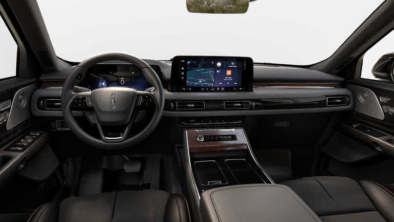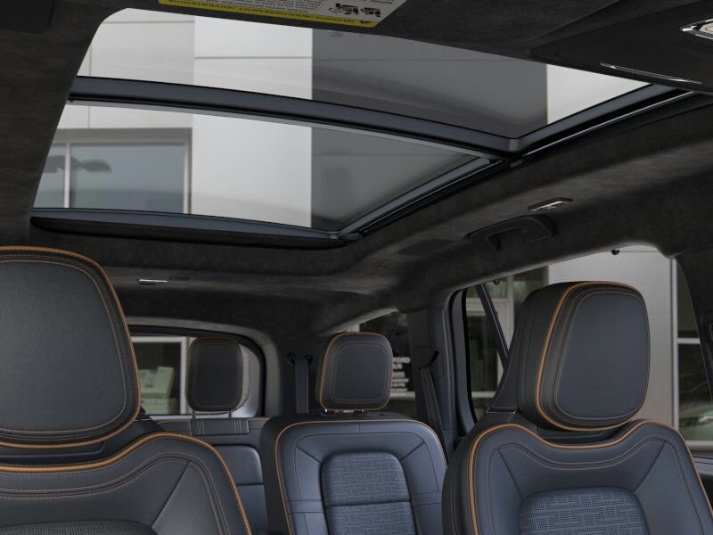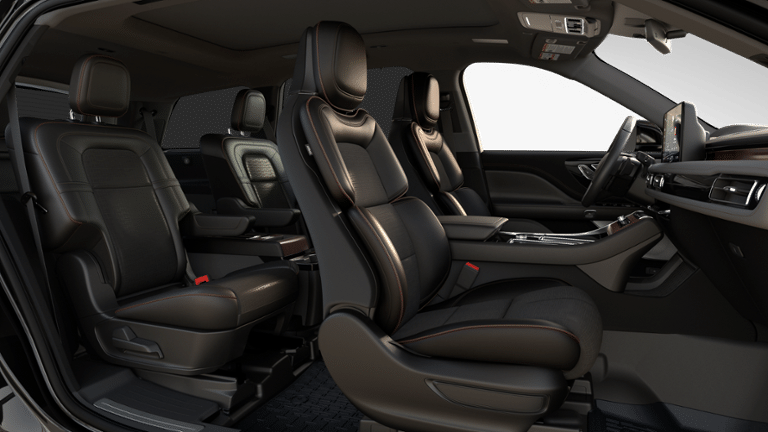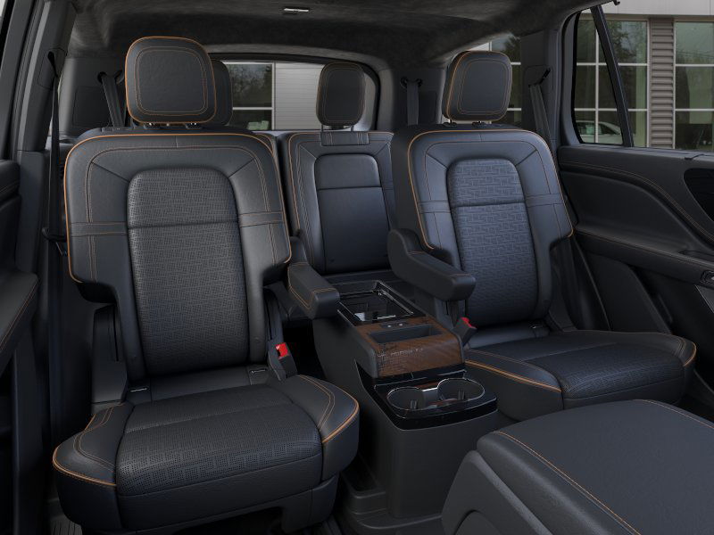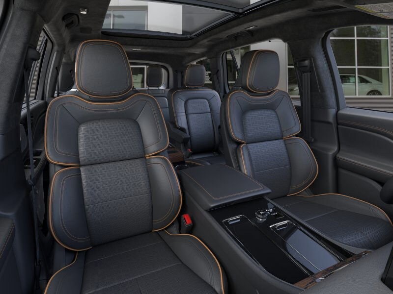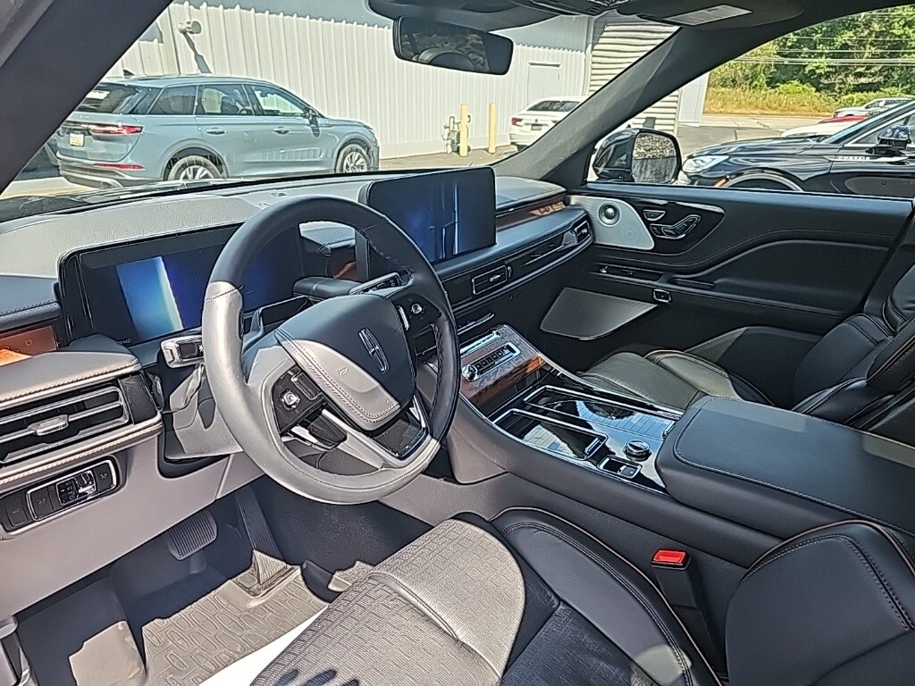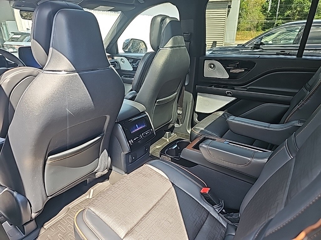 Equipment Group 800A, 28 Speakers, 30-Way Perfect Position Seats w/Active Motion, 3rd row seats: split-bench, 4-Wheel Disc Brakes, ABS brakes, Adaptive suspension, Air Conditioning, All-Weather 1st & 2nd Row Floor Liners, Alloy wheels, AM/FM radio: SiriusXM, Apple CarPlay/Android Auto, Audio memory, Auto High-beam Headlights, Auto-dimming door mirrors, Auto-dimming Rear-View mirror, Automatic temperature control, Brake assist, Bumpers: body-color, Compass, Delay-off headlights, Driver door bin, Driver vanity mirror, Dual front impact airbags, Dual front side impact airbags, Electronic Stability Control, Emergency communication system: SYNC 4 911 Assist, Four wheel independent suspension, Front anti-roll bar, Front Bucket Seats, Front Center Armrest, Front dual zone A/C, Front reading lights, Full Rear Console, Fully automatic headlights, Garage door transmitter, Head restraints memory, Heads-Up Display, Heated door mirrors, Heated front seats, Heated rear seats, Heated steering wheel, HVAC memory, Illuminated entry, Knee airbag, Leather steering wheel, Lincoln Digital Experience, Low tire pressure warning, Memory seat, Navigation system: Connected Navigation (1-year trial), Occupant sensing airbag, Outside temperature display, Overhead airbag, Overhead console, Panic alarm, Passenger door bin, Passenger vanity mirror, Power adjustable front head restraints, Power door mirrors, Power driver seat, Power Liftgate, Power moonroof: Panoramic Vista Roof, Power passenger seat, Power steering, Power windows, Radio data system, Radio: Revel Ultima 3D Audio System w/28 Speakers, Rain sensing wipers, Rear air conditioning, Rear anti-roll bar, Rear audio controls, Rear dual zone A/C, Rear reading lights, Rear window defroster, Rear window wiper, Remote keyless entry, Savannah Leather Heated/Ventilated Seats (76A), Security system, SiriusXM, Speed control, Speed-Sensitive Wipers, Split folding rear seat, Spoiler, Steering wheel memory, Steering wheel mounted A/C controls, Steering wheel mounted audio controls, Tachometer, Telescoping steering wheel, Tilt steering wheel, Traction control, Trip computer, Turn signal indicator mirrors, Variably intermittent wipers, Ventilated front seats, Ventilated rear seats, and Wheels: 22" Bright-Machined Aluminum.